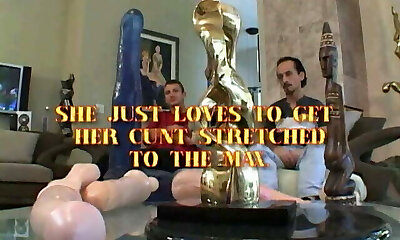 Whore taking huge dildo in her slit