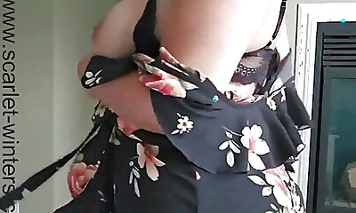 Naughty woman wearing skimpy sundress Amber Hahn is masturbating her muff