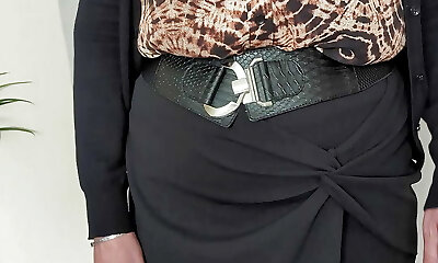 Going to work in a blouse, miniskirt ,stockings and heels. Ready for my younger boss to inspect my mature baps, ass and bald cunt.